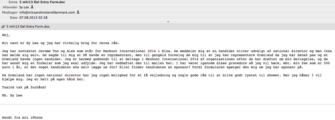 Sy Lee har op til flere gange taget kontakten til os for at komme i betragtning som den danske repræsentant til en skønhedskonkurrence, men er ikke kommet igennem nåleøjet. Han har derefter rettet direkte kontakt til den internationale Manhunt International Organisation, i håb om at stille op for Grønland, selvom Grønland normalt ikke er repræsenteret som et selvstændigt land. Det skal påpeges at Sy Lee ikke har en grønlandsk baggrund.